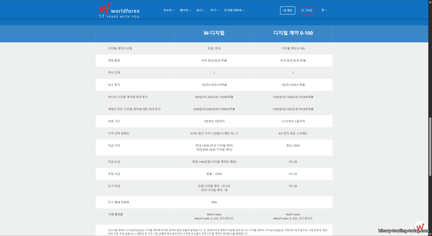 이 브로커의 차별점은 디지털 계약 — 바이너리 옵션 — 을 별도 W-DIGITAL 계좌로 제공한다는 점입니다. FX 브로커 가운데 드문 편이며, World Forex는 2010년대 초부터 이 상품을 제공해 왔습니다. 구성은 다음과 같습니다: