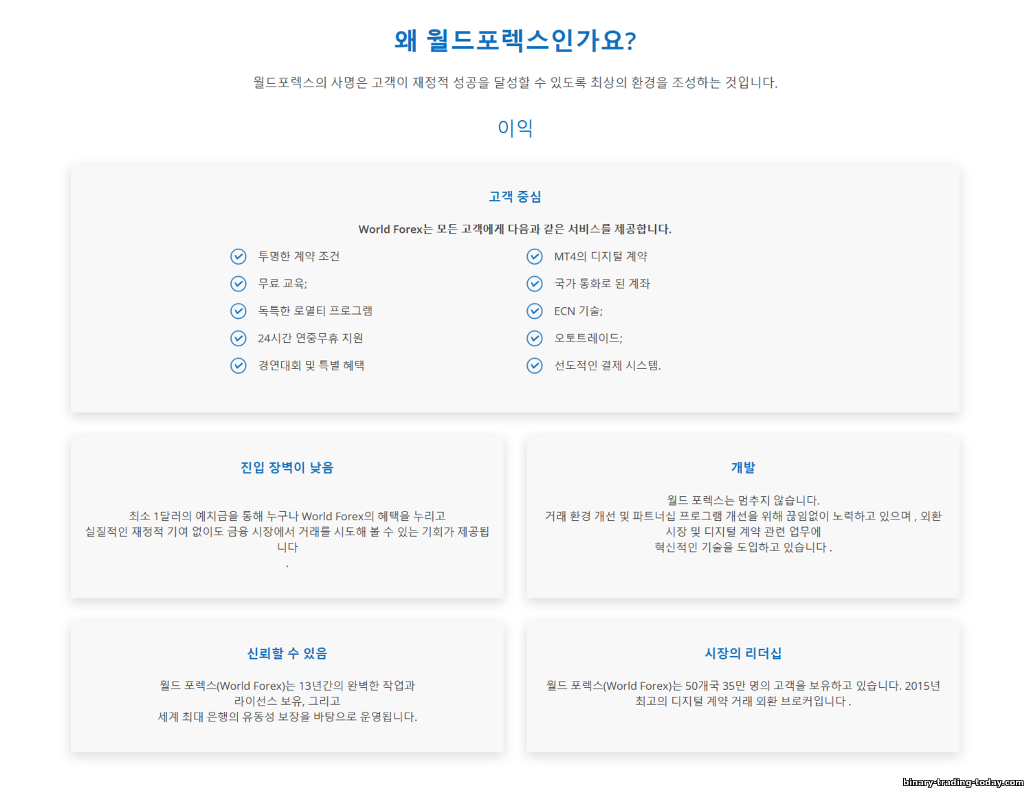 World Forex 소개. World Forex(거래명 WForex)는 2007년부터 활동 중인 국제 FX 온라인 브로커입니다. 전통적인 포렉스 거래, 주식·원자재 CFD를 제공하며, 여기에 디지털 계약(바이너리 옵션)을 결합한 점이 특징입니다. 오프쇼어 등록이지만 15년+ 동안 50개국에서 35만 명 이상의 트레이더를 유치했습니다. 최소 입금은 $1로 업계에서도 접근성이 높은 편입니다. World Forex는 초보자(센트 계좌, 교육)부터 숙련된 알고리즘 투자자(ECN 계좌, VPS 호스팅)까지 다양한 수준의 개인 트레이더를 대상으로 합니다.