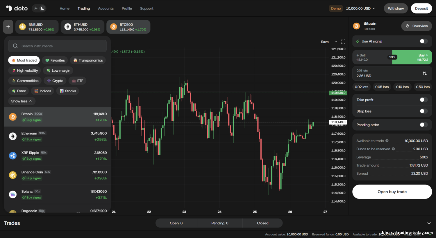 - Doto – 기술 중심 브로커입니다. TradingView 차트와 내장 뉴스가 있는 자체 플랫폼을 제공하면서, 클래식 터미널을 선호하는 사용자에게는 MetaTrader 4/5도 지원합니다. 진입 장벽은 비교적 낮고($15), 규제도 키프로스(CySEC), 남아공(FSCA) 등 인지 가능한 관할을 포함합니다. 표준 계정 스프레드는 약 1 pip부터이며, 스프레드가 거의 0에 가까운 Raw 계정(수수료 ~$6)은 스캘퍼에게 적합할 수 있습니다. 참고: 180일+ 거래가 없으면 휴면/보관 수수료가 부과될 수 있습니다. 전반적으로, 사용성과 프로 기능을 함께 제공하는 ‘신생 유망’ 옵션입니다.